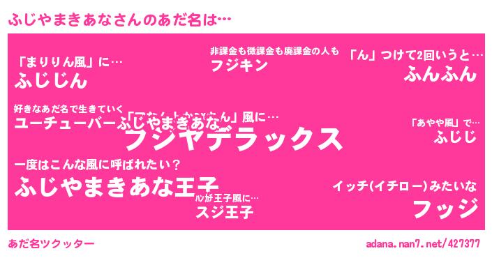 | ヘコむあだ名 | 『ふじふぇ~』『豆乳』『ふじぷりん』『ふじやまきあな(小並感)』 |