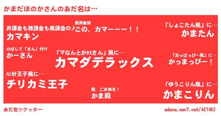 | ヒーロー風カッコイイあだ名 | 『ネオカマダホノカ』『ウルトラ戦士カマダホノカ』『幻影騎士カマ』 |