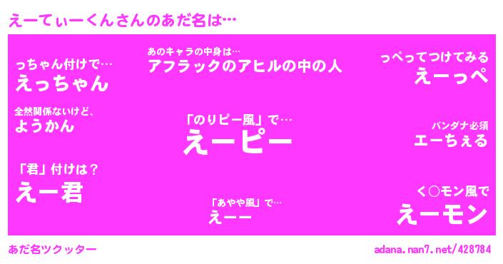 | 2回繰り返すあだ名 | 『とぷとぷ』『しゃなりしゃなり』『わいわい』『へらへら』 |