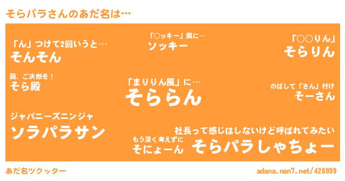 | ヘコむあだ名 | 『そらふぇ~』『豆乳』『そらぷりん』『そらパラ(小並感)』 |