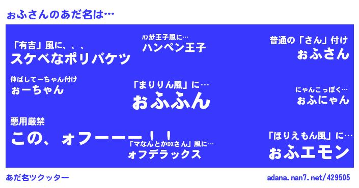 | 男性向けラノベタイトル風あだ名 | 『Re:ぉふから始める異世界生活』『ぉふの憂鬱』 |