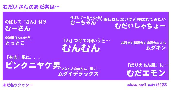 | ヘコむあだ名 | 『むだふぇ~』『豆乳』『むだぷりん』『むだい(小並感)』 |
