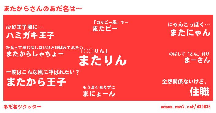 | 意味不明あだ名 | 『自称またから』『たけのこ科またから属』『とにかく怪しいまたから』 |