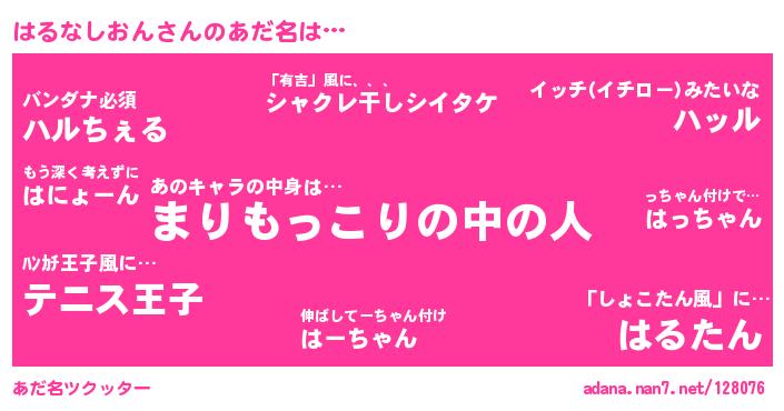 | ヘコむあだ名 | 『はるふぇ~』『豆乳』『はるぷりん』『はるなしおん(小並感)』 |