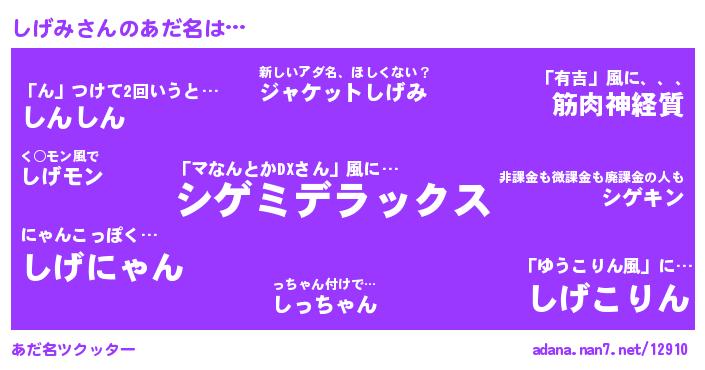 | 男性向けラノベタイトル風あだ名 | 『シゲミアートオンライン』『はたらくしげみさま!』『魔弾の王としげみ』 |