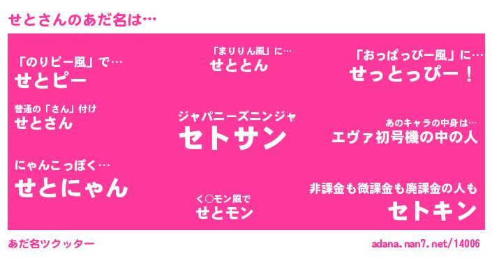 | ヒーロー風カッコイイあだ名 | 『ネオセト』『スーパーセト』『銀牙騎士セト』『ウルトラせとマン』 |
