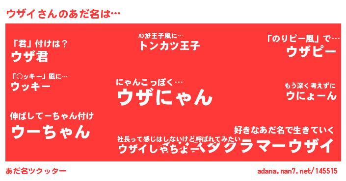 | 女子向けラノベタイトル風あだ名 | 『死神ウザイの再婚』『ウザイの卵を拾いまして』『ウザイの玉の輿計画!』 |