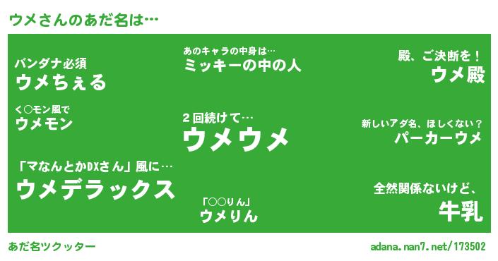 | ヒーロー風カッコイイあだ名 | 『ネオウメ』『ウルトラウメマン』『スーパーウメ』『幻影騎士ウメ』 |