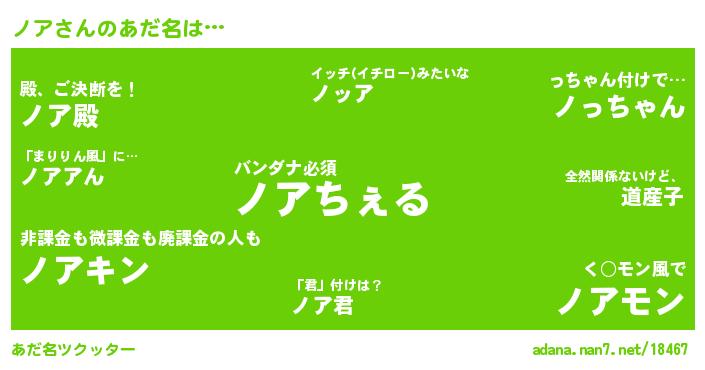 | ポケモン風あだ名 | 『メロノッア』『ノアセウス』『ノックウザ』『ノアチュウ』 |