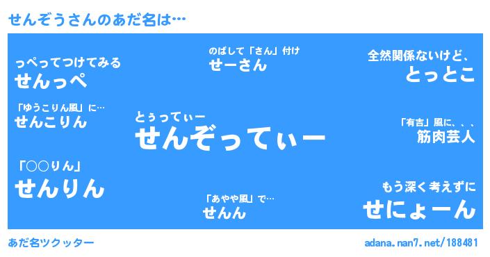 | 意味不明あだ名 | 『ニラ科せんぞう属』『自称せんぞう』『永久保存せんぞう』 |