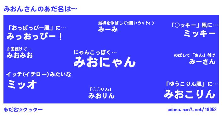 | 欧米人風あだ名 | 『ケンブリッジみおん』『トリンドルみおん』『ウサインみおん』 |