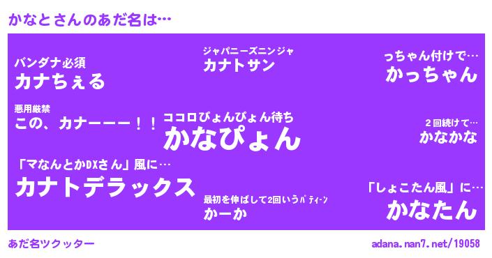 | ヘコむあだ名 | 『かなふぇ~』『豆乳』『かなぷりん』『かなと(小並感)』 |