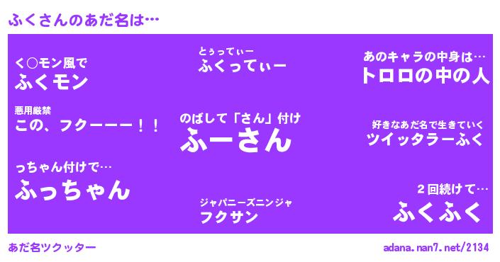 | 欧米人風あだ名 | 『マイケルふく』『アンジェラ・ふく』『ダレノガレふく』 |