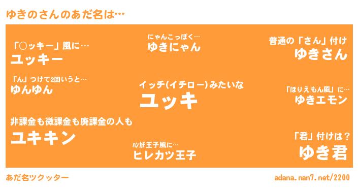 | ポケモン風あだ名 | 『ユーキイ』『メロユッキ』『ユキキング』『ユックウザ』 |