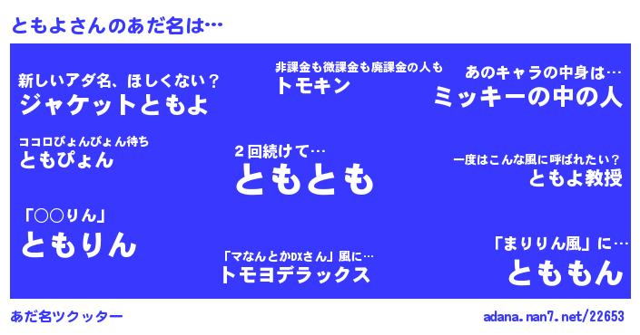 | 肩書あだ名 | 『ともよ艦長』『ともよ学科長』『ともよ大統領』『ともよ社長』 |