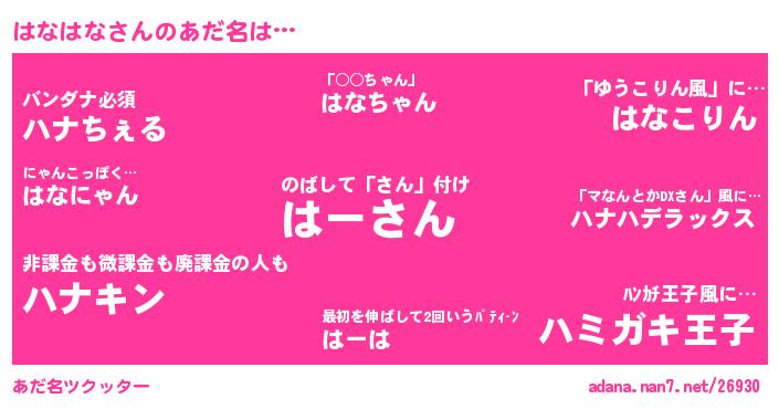 | ヘコむあだ名 | 『はなふぇ~』『豆乳』『はなぷりん』『はなはな(小並感)』 |