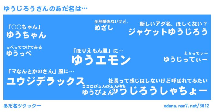 | 男性向けラノベタイトル風あだ名 | 『ゆうじろうの嫁は女の子じゃないと思った?』 |