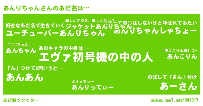 | ヘコむあだ名 | 『あんふぇ~』『豆乳』『あんぷりん』『あんりちゃん(小並感)』 |