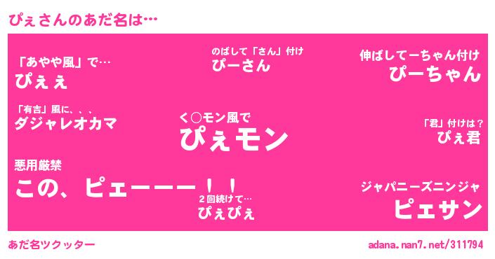 | ヒーロー風カッコイイあだ名 | 『仮面ピェダー』『魔戒騎士ピェ』『天空の使者ぴぇ』『ネオピェ』 |