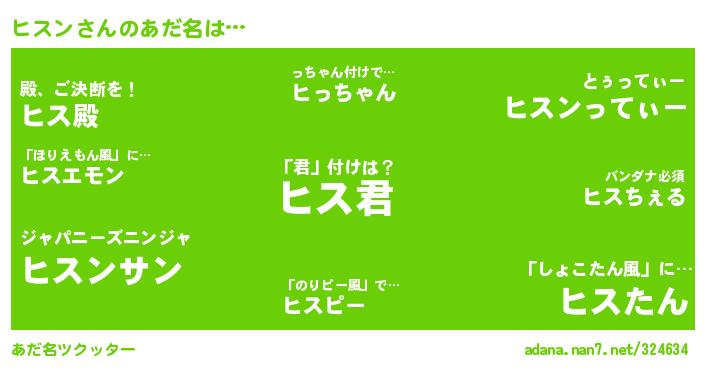 | 男性向けラノベタイトル風あだ名 | 『ヒスンアートオンライン』『この素晴らしい世界にヒスンを!』 |