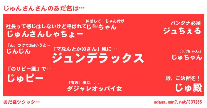 男性向けラノベタイトル風あだ名 | 『うちのじゅんさんが世界を掌握している!』『ジュンサンアートオンライン』 |