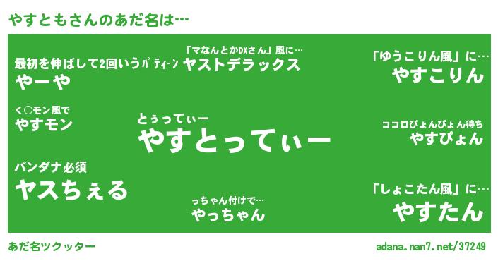 | 男性向けラノベタイトル風あだ名 | 『やすともの嫁は女の子じゃないと思った?』『冴えないやすともの育てかた』 |