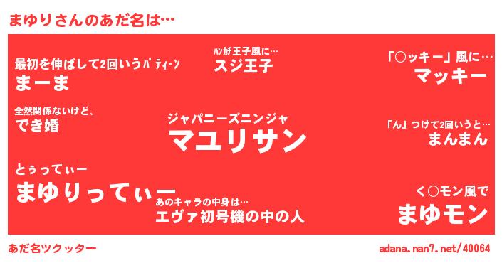 | ヒーロー風カッコイイあだ名 | 『仮面マユダー』『友情の使者まゆり』『幻影騎士マユ』 |