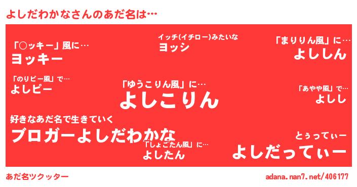 | ファンタジー風あだ名 | 『カークヨシラー』『ゼヨシトゥ』『エターナルヨシダワカナー』 |