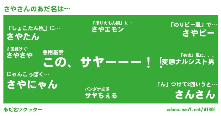 | 男性向けラノベタイトル風あだ名 | 『Re:さやから始める異世界生活』『さやの嫁は女の子じゃないと思った?』 |