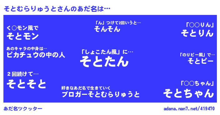 | ヒーロー風カッコイイあだ名 | 『仮面ソトダー』『友情の使者そとむらりゅうと』『幻影騎士ソト』 |