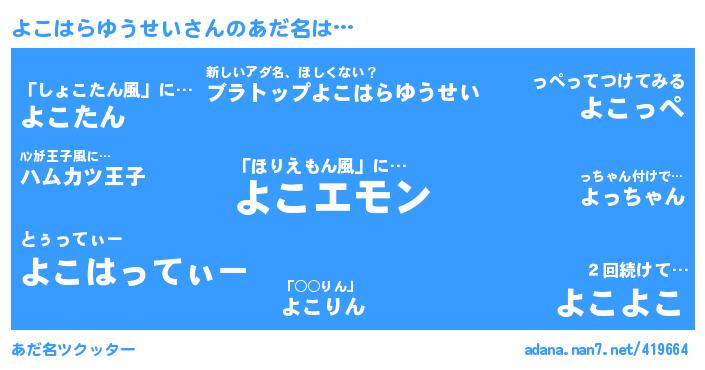 | 意味不明あだ名 | 『住所不定無職よこはらゆうせい(40歳)』『自称よこはらゆうせい』 |