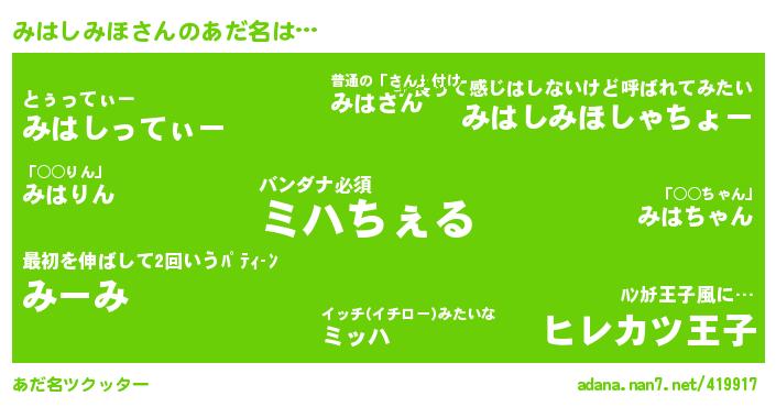 | ポケモン風あだ名 | 『ゼニミハ』『ミハセウス』『ヒミハシミホ』『ミハチュウ』 |
