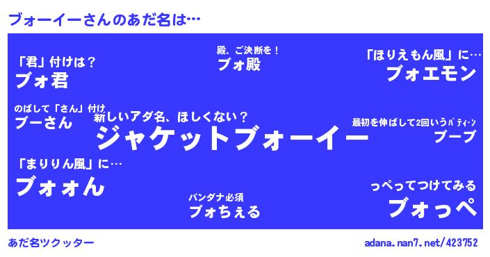 | 男性向けラノベタイトル風あだ名 | 『この素晴らしい世界にブォーイーを!』『転生したらブォーイーだった件』 |