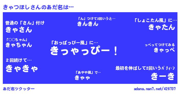意味不明あだ名 | 『ニラ科きゃつほし属』『永久保存きゃつほし』『自称きゃつほし』 |