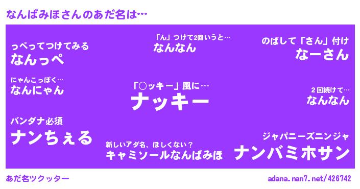 男性向けラノベタイトル風あだ名 | 『なんばみほの嫁は女の子じゃないと思った?』『はたらくなんばみほさま!』 |