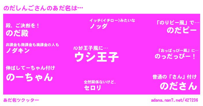 | ヘコむあだ名 | 『のだふぇ~』『豆乳』『のだぷりん』『のだしんご(小並感)』 |