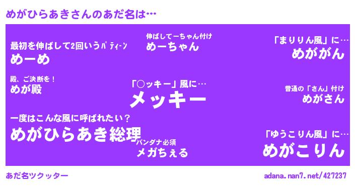 | ヘコむあだ名 | 『めがふぇ~』『豆乳』『めがぷりん』『めがひらあき(小並感)』 |