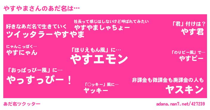 | 男性向けラノベタイトル風あだ名 | 『やすやまの嫁は女の子じゃないと思った?』『やすやまの憂鬱』 |