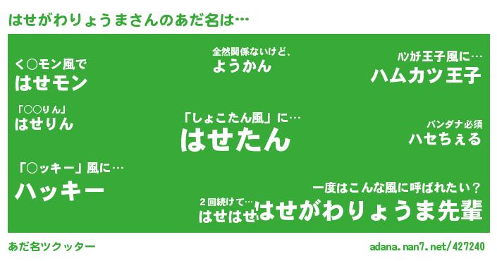 | 意味不明あだ名 | 『住所不定無職はせがわりょうま(40歳)』『永久保存はせがわりょうま』 |