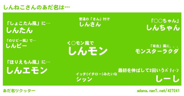 | 意味不明あだ名 | 『永久保存しんねこ』『とにかく怪しいしんねこ』『なめこ科しんねこ属』 |