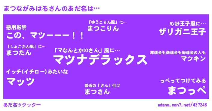 | ヘコむあだ名 | 『まつふぇ~』『豆乳』『まつぷりん』『まつながみはる(小並感)』 |