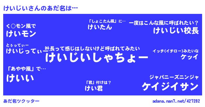 | 意味不明あだ名 | 『けいじいフォーエバー』『自称けいじい』『永久保存けいじい』 |