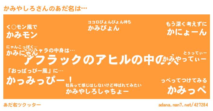 | 男性向けラノベタイトル風あだ名 | 『ノーゲーム・ノーカミヤシロ』『冴えないかみやしろの育てかた』 |