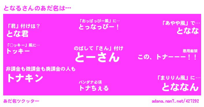 | ヘコむあだ名 | 『となふぇ~』『豆乳』『となぷりん』『となる(小並感)』 |