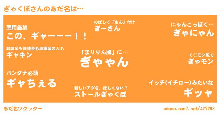 | 男性向けラノベタイトル風あだ名 | 『ぎゃくぼに滅ぼされるだけの簡単なお仕事です』『ギャクボアートオンライン』 |