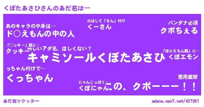 | 男性向けラノベタイトル風あだ名 | 『くぼたあさひ~年齢イコール彼女いない歴の魔法使い~』 |