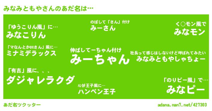 | 男性向けラノベタイトル風あだ名 | 『ミナミトモヤアートオンライン』『Re:みなみともやから始める異世界生活』 |