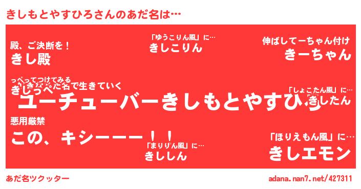 | 男性向けラノベタイトル風あだ名 | 『キシモトヤスヒロアートオンライン』『魔法科高校のきしもとやすひろ』 |