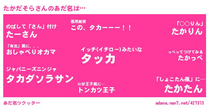 | ヒーロー風カッコイイあだ名 | 『仮面タカダー』『魔戒騎士タカ』『スーパータカダソラ』 |