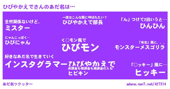 | 欧米人風あだ名 | 『ケンブリッジひびやかえで』『ひびやかえでクリステル』 |